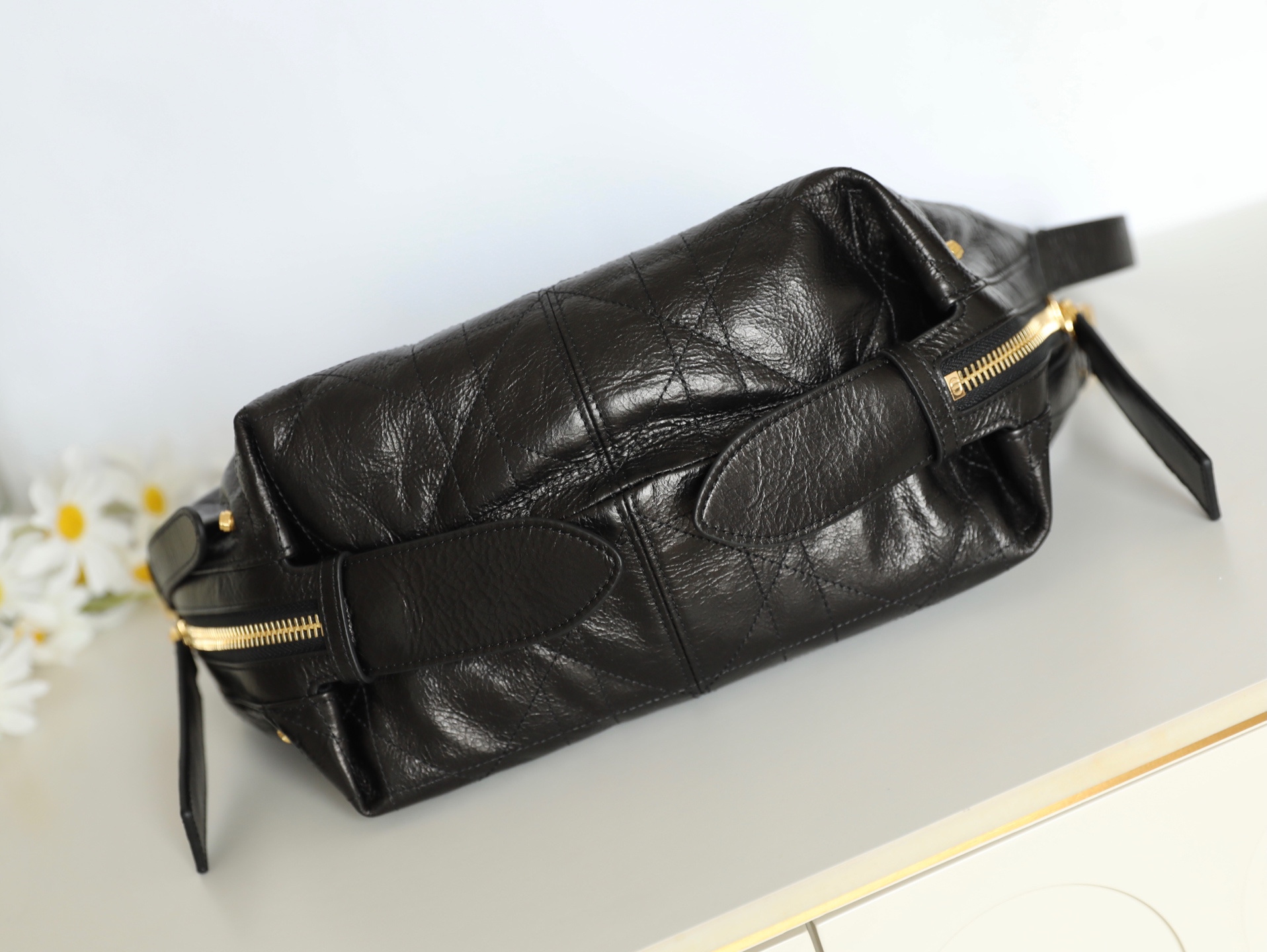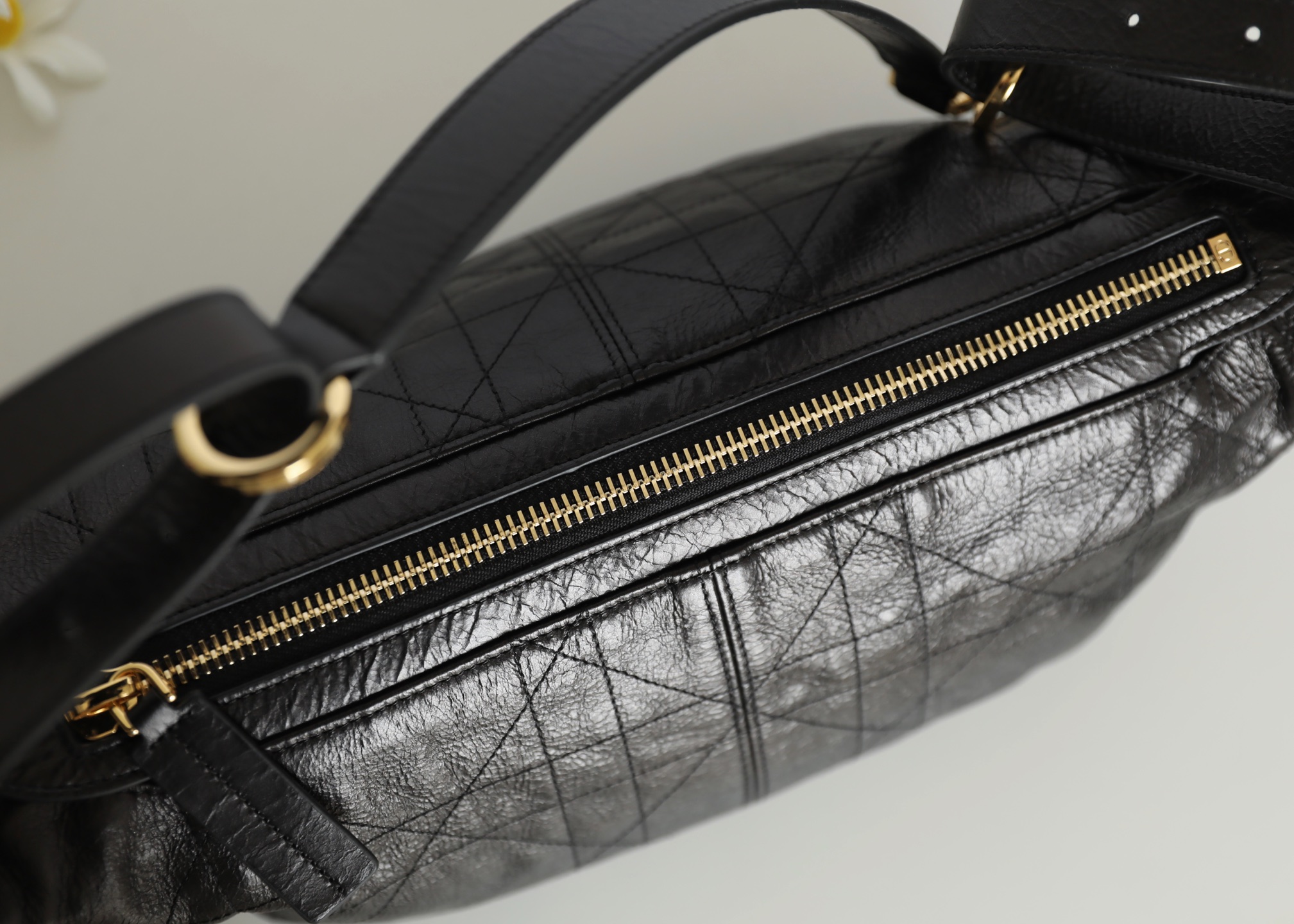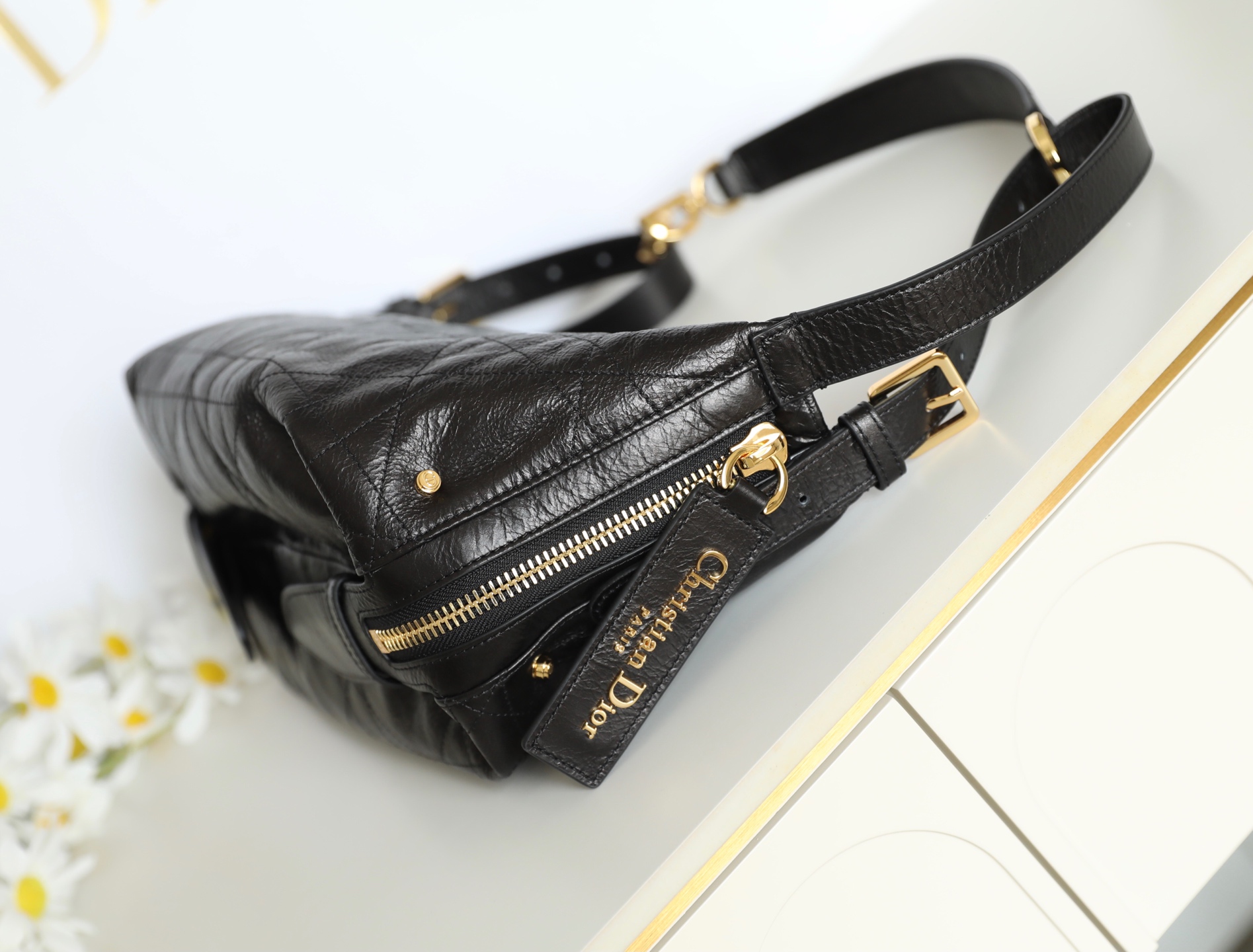 "Marries supple black crinkled leather with reimagined Cannage detailing, offering a contemporary take on Dior's heritage. The dumpling-inspired silhouette and functional compartments make it a versatile choice for both casual outings and elevated occasions—where modern design meets timeless craftsmanship."